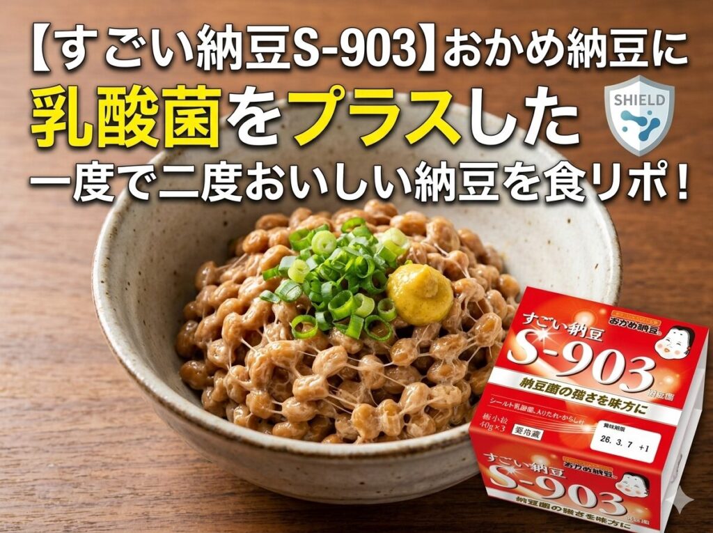こんにちは!年間600パック以上の納豆を食べる納豆大好き人間です! 今回紹介する納豆は、おかめ納豆「すごい納豆S-903」です! 花粉症にも聞くといわれる菌活におすすめの乳酸菌入りの健康志向納豆!その味やいかに! 美味しさも健康も両取り! ふるさと... -